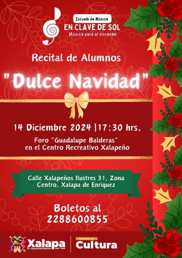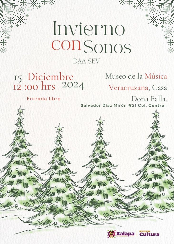 A las 16:00 horas, en el MUXA se tendrá la charla “La cultura como derecho humano”. A las 17:00 horas, habrá un recital de guitarra con Jesús Viveros en el Museo de la Música Veracruzana, seguido por el recital de alumnos “Dulce Navidad”, a las 17:30 horas, en el CRX, evento presentado por la Escuela de Música “Enclave de Sol”.