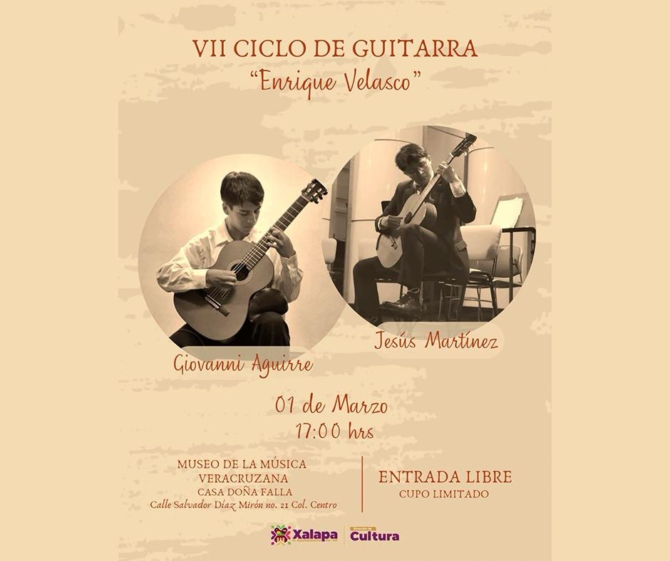 El sábado 1 de marzo Giovanni Aguirre y Jesús Martínez participarán en el VII Ciclo de Guitarra “Enrique Velasco”, en el Museo de la Música Veracruzana, a las 17:00 horas.