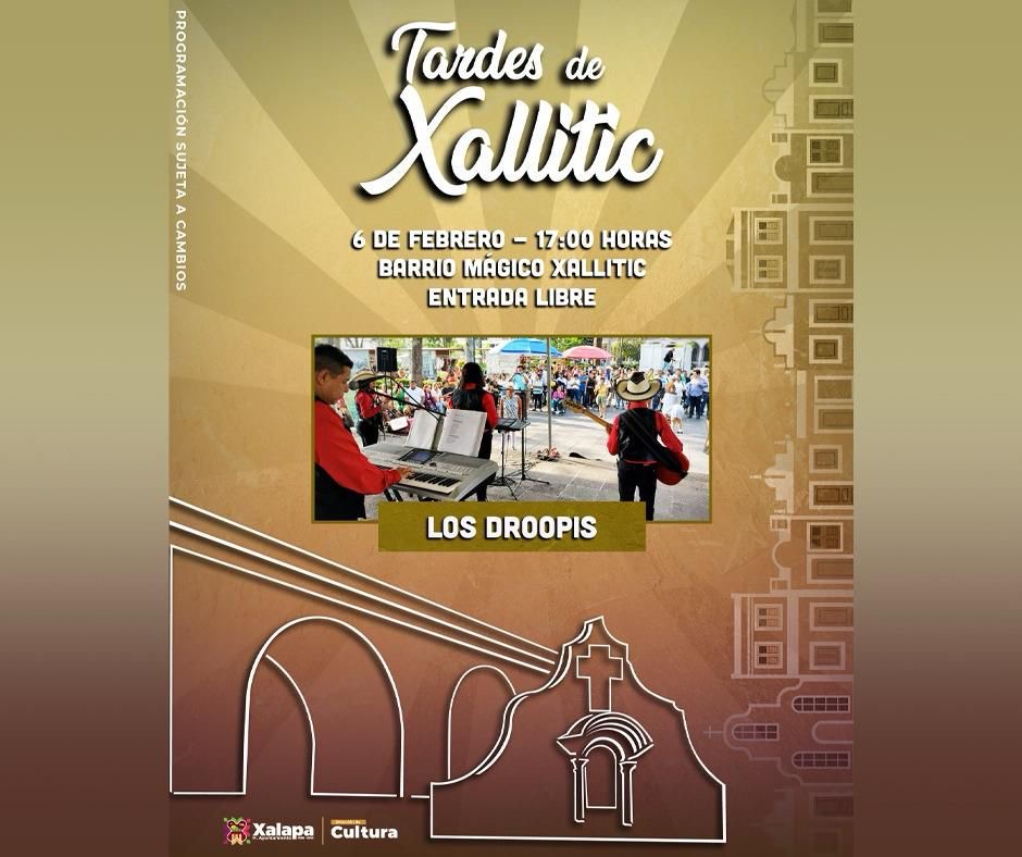 Este jueves a partir de las 17:00 horas, el grupo Los Droopis estará en las “Tardes de Xallitic”, y a las 18:00 horas, se inaugurará la exposición “La Incierta Forma”, de Felipe de Jesús Capistrán Contreras, en el Centro Recreativo Xalapeño (CRX).
