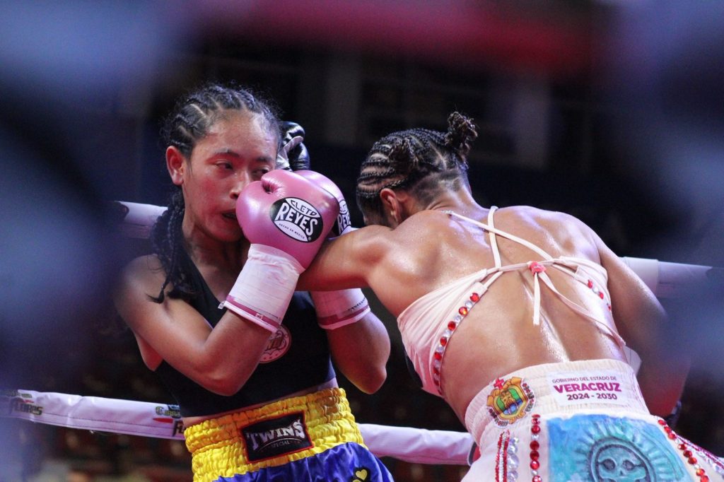 Veracruz, Ver., domingo 27 de julio de 2025.- En una emocionante pelea, apoyada y arropada por su gente, la veracruzana Esneidy La Leona Rodríguez retuvo su título mundial Plata de la WBC en Peso Átomo al vencer por nocaut técnico en el quinto asalto a la tailandesa WisutaSririttidet, en una pelea pactada a 10 rounds.