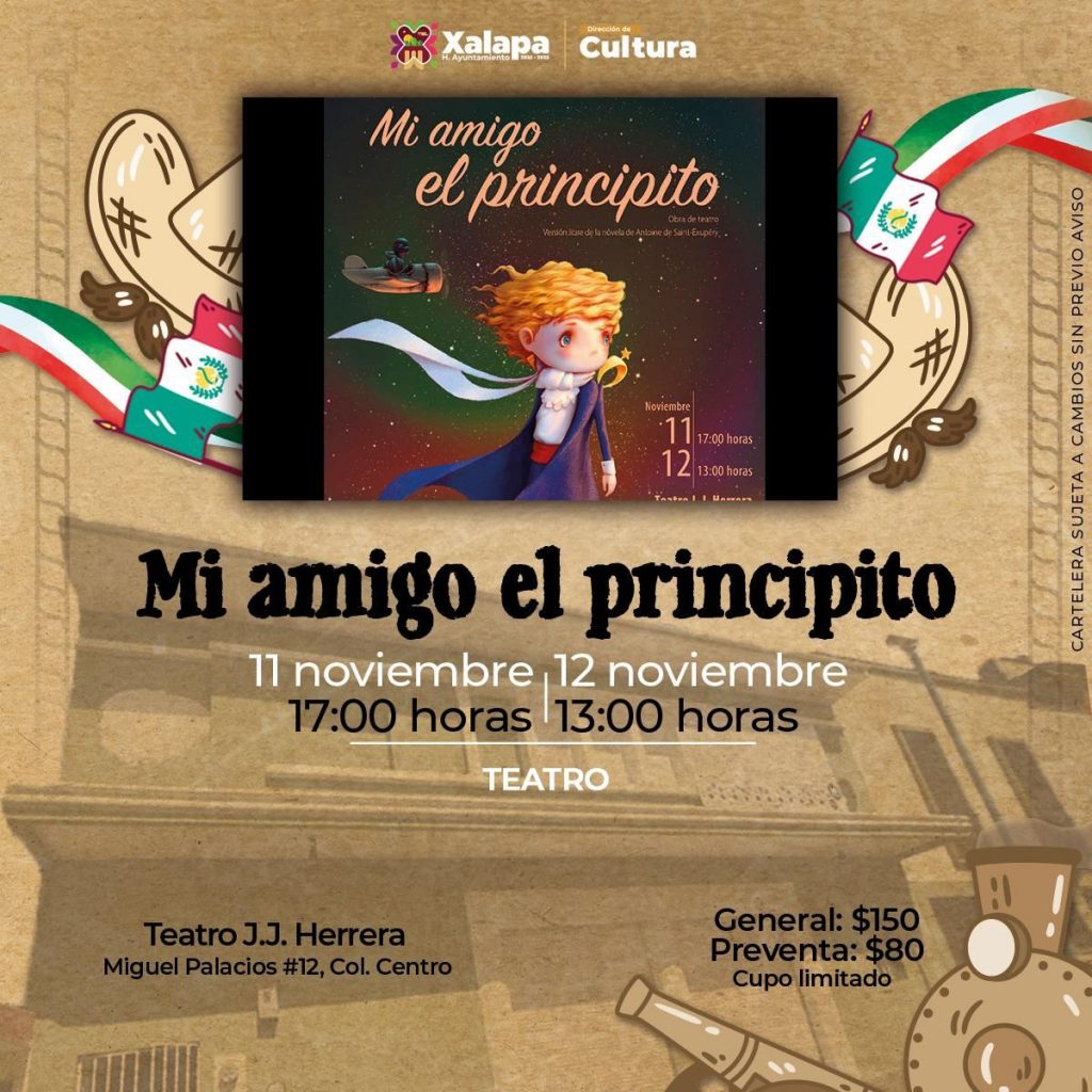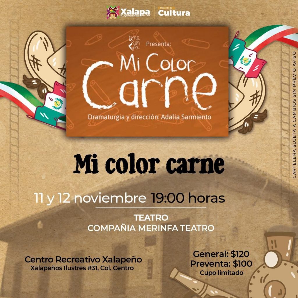 Los días 11 y 12 de noviembre a las 17:00 y 13:00 horas, respectivamente, en el Teatro J.J. Herrera se presentará la obra “Mi amigo el Principito”, y a las 19:00 horas en el Centro Recreativo Xalapeño, Marinfa Teatro presentará “Mi color carne”, de Adalia Sarmiento.