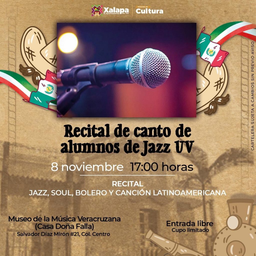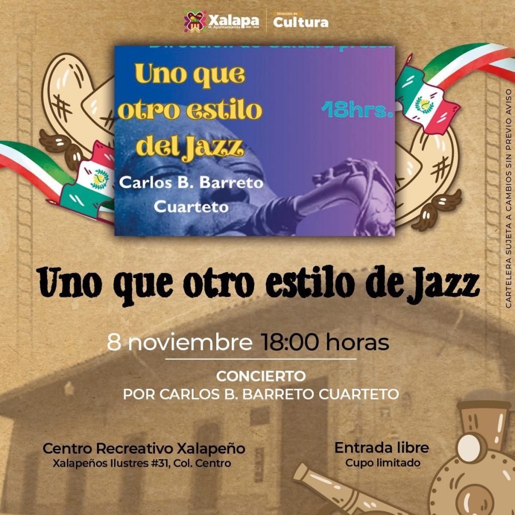 El 8 de noviembre a las 17:00 horas en este mismo lugar, los alumnos de Jazz UV encabezarán el recital de canto de Jazz, Soul, Bolero y Canción Latinoamericana; a las 18:00 horas y 19:00 horas en el Centro Recreativo Xalapeño, Carlos B. Barreto Cuartero y Miguel Gómez Trío ofrecerán los conciertos “Uno que otro estilo del jazz” y “Standards de películas norteamericanas”.