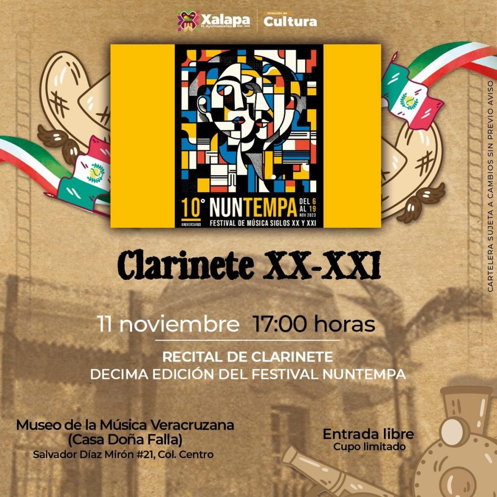 El 11 de noviembre a las 17:00 horas, la Orquesta Pauta Nueva ofrecerá un concierto en la Calle Líderes de la Colonia Unión, y a la misma hora, pero en el Museo de la Música Veracruzana se llevará a cabo el recital “Clarinete XX-XXI”.