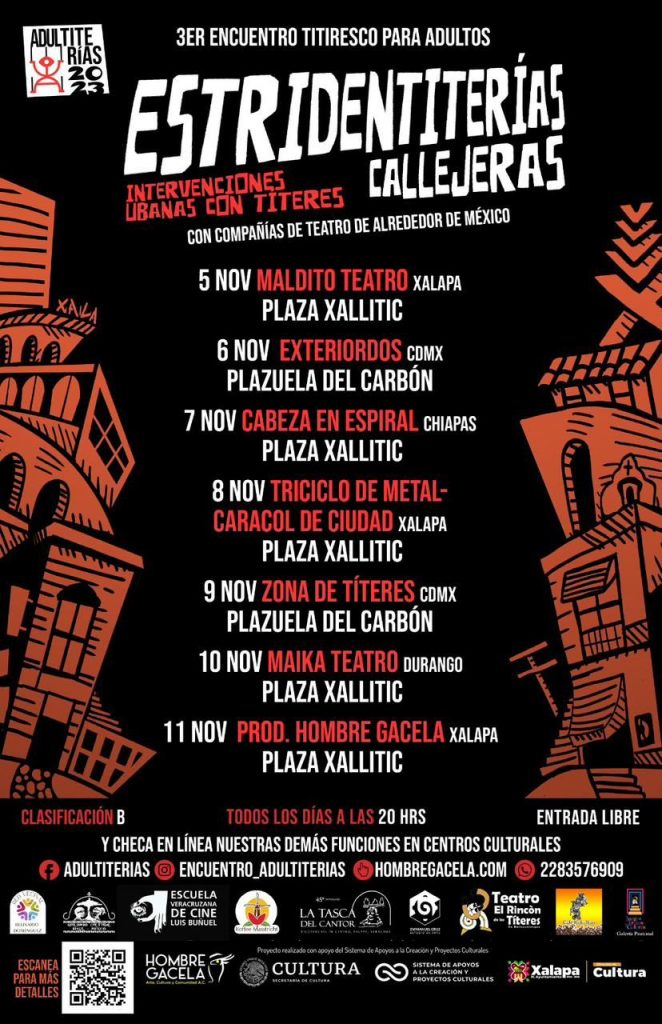 Además, del 5 al 11 de noviembre y como parte del Tercer Encuentro Titiresco para Adultos, se realizará Estridentiterías Callejera (Intervenciones urbanas con títeres), inspirada en el Poema Prisma de Manuel Maples Arce, en lugares emblemáticos de la capital veracruzana como la Plazuela de El Carbón, el Barrio Mágico de Xallitic y el Parque Sandino.
