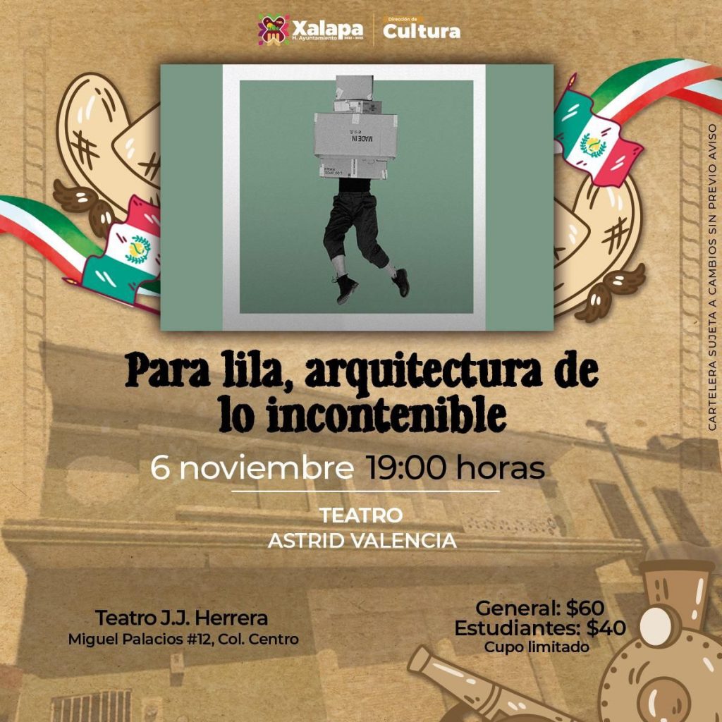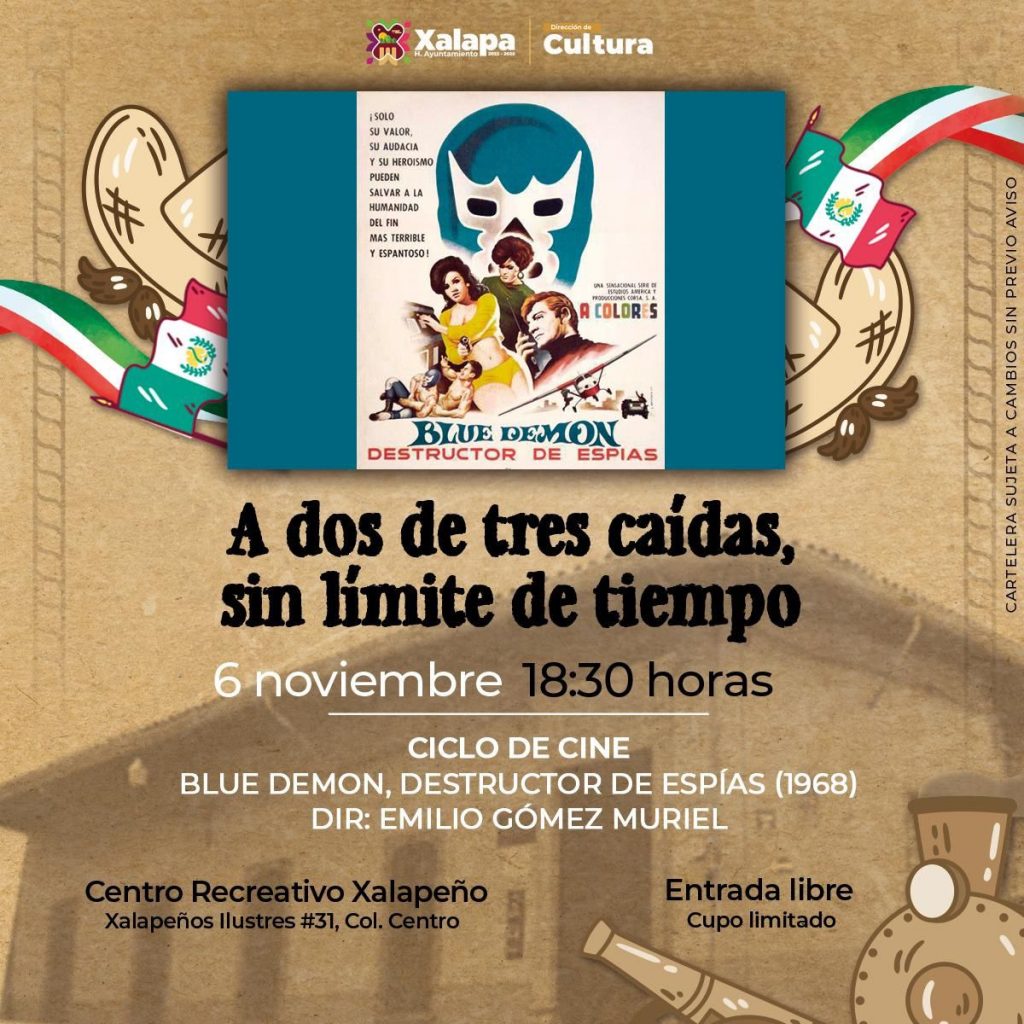 También se realizará el Ciclo de Cine “A dos de tres caídas, sin límite de tiempo”, con la proyección de la película “Blue Demon, destructor de espías” (1968), del director Emilio Gómez Muriel, este 6 de noviembre a las 18:30 horas en el Centro Recreativo Xalapeño; a las 19:00 horas en el Teatro J.J. Herrera, se presenta la puesta en escena “Para Lila, arquitectura de lo incontenible”, de Astrid Valencia.