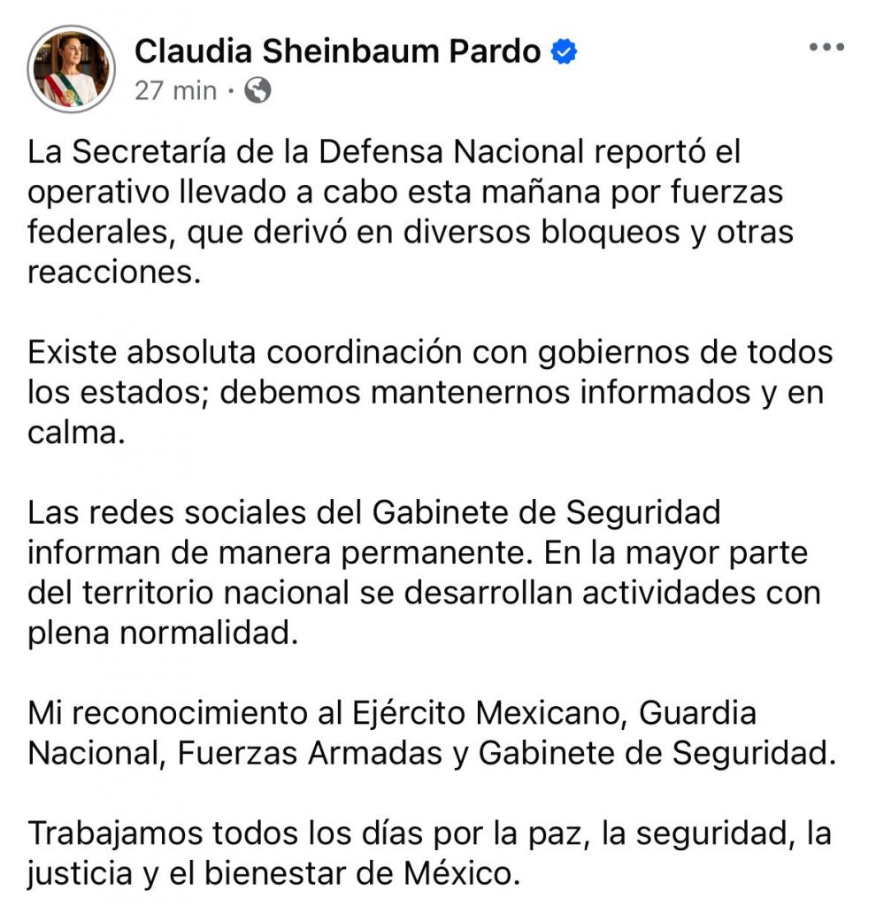 La presidenta de México, Claudia Sheinbaum Pardo , fijó su postura sobre los hechos ocurridos este día, luego de que la Secretaría de la Defensa Nacional informara sobre un operativo realizado por fuerzas federales que derivó en diversos bloqueos y reacciones en distintos puntos.