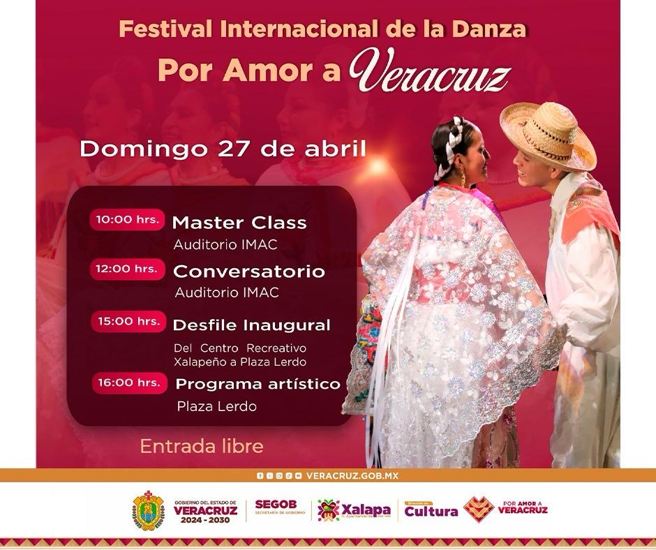 El domingo 27 de abril, a las 10:00 horas, en el auditorio de la IMAC, iniciará el Festival Internacional de Danza “Por amor a Veracruz”, con una master class. A las 12:00 horas, en el mismo recinto, se llevará a cabo un conversatorio, como parte de las actividades del festival.