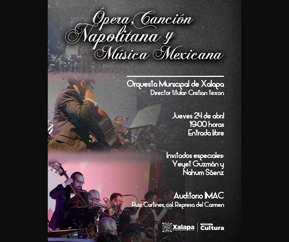 En el auditorio de la IMAC, se ofrecerá el concierto de la Orquesta Municipal de Xalapa: “Ópera, Canción Napolitana y Música Mexicana”, con la participación de Nahum Sáenz y Yeyet Guzmán.