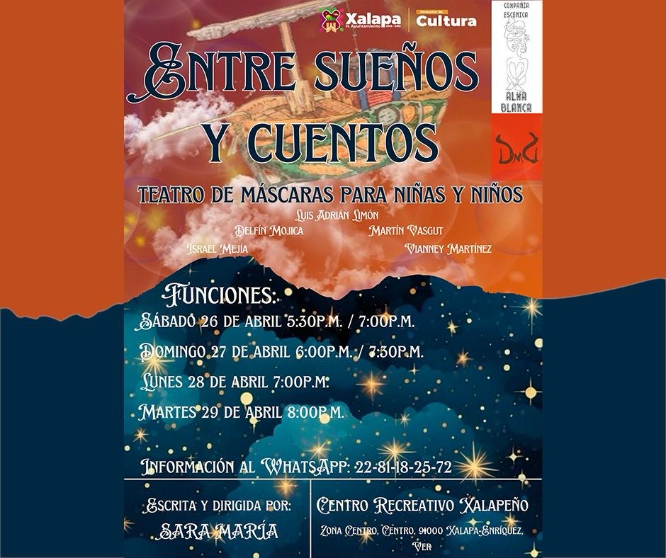 En el CRX, a las 17:50 horas, comenzará la obra de teatro de máscaras para niñas y niños “Entre sueños y cuentos”, la cual se repetirá el domingo 27 de abril con doble función.