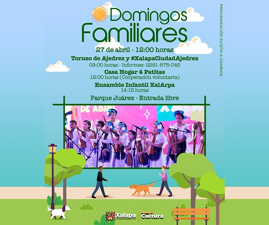 A las 12:00 horas, en distintos espacios públicos, se podrá disfrutar de “Domingos Familiares”, con actividades como el Torneo de Ajedrez, la participación de Casa Hogar 4 Patitas y la presentación del Ensamble Infantil Xalarpa. A las 15:00 horas, se realizará el desfile inaugural que partirá del CRX a Plaza Lerdo, donde concluirá con una presentación artística.