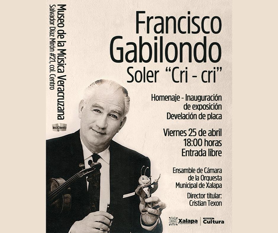 A las 18:00 horas se realizarán dos eventos. En el CRX se tendrá el concierto “La música abre puertas”, el cual también se presentará el 30 de abril; mientras que en el Museo de la Música Veracruzana se inaugurará la exposición dedicada a Francisco Gabilondo Soler, con la participación del Ensamble de Cámara de la Orquesta Municipal de Xalapa.