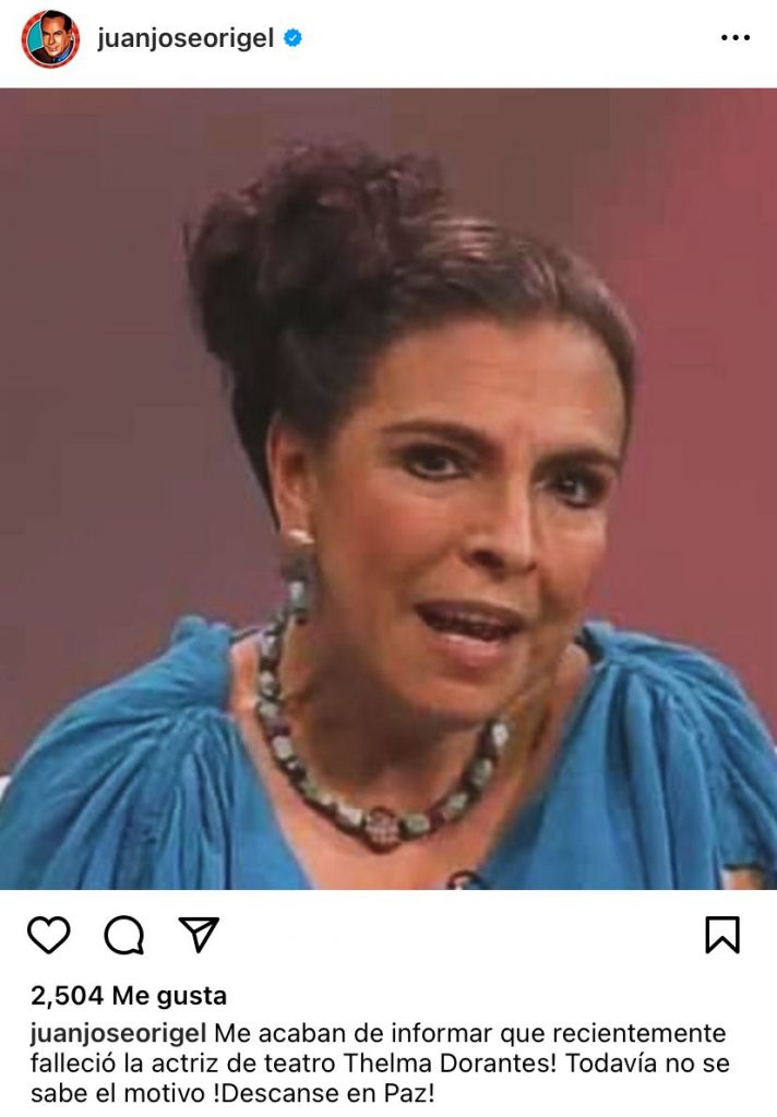 “Me acaban de informar que recientemente falleció la actriz de teatro Thelma Dorantes. Todavía no se sabe el motivo. Descanse en Paz”, publicó el comunicador el 10 de marzo en Instagram.