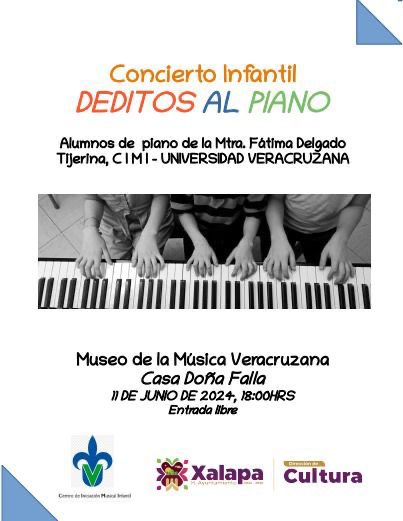 El 11 de junio a las 18:00 horas, en el Museo de la Música Veracruzana, alumnos del Centro de Iniciación Musical Infantil ofrecerán el concierto “Deditos al piano”. Además, en el Museo Casa de Xalapa, Paulo César López Romero encabezará la conferencia “Las colonias agrícolas de Xalapa”, y en el Teatro J.J. Herrera se proyectará la película “Los Sueños” (1990), en el marco del Ciclo de Cine “Akira Kurosawa”.
