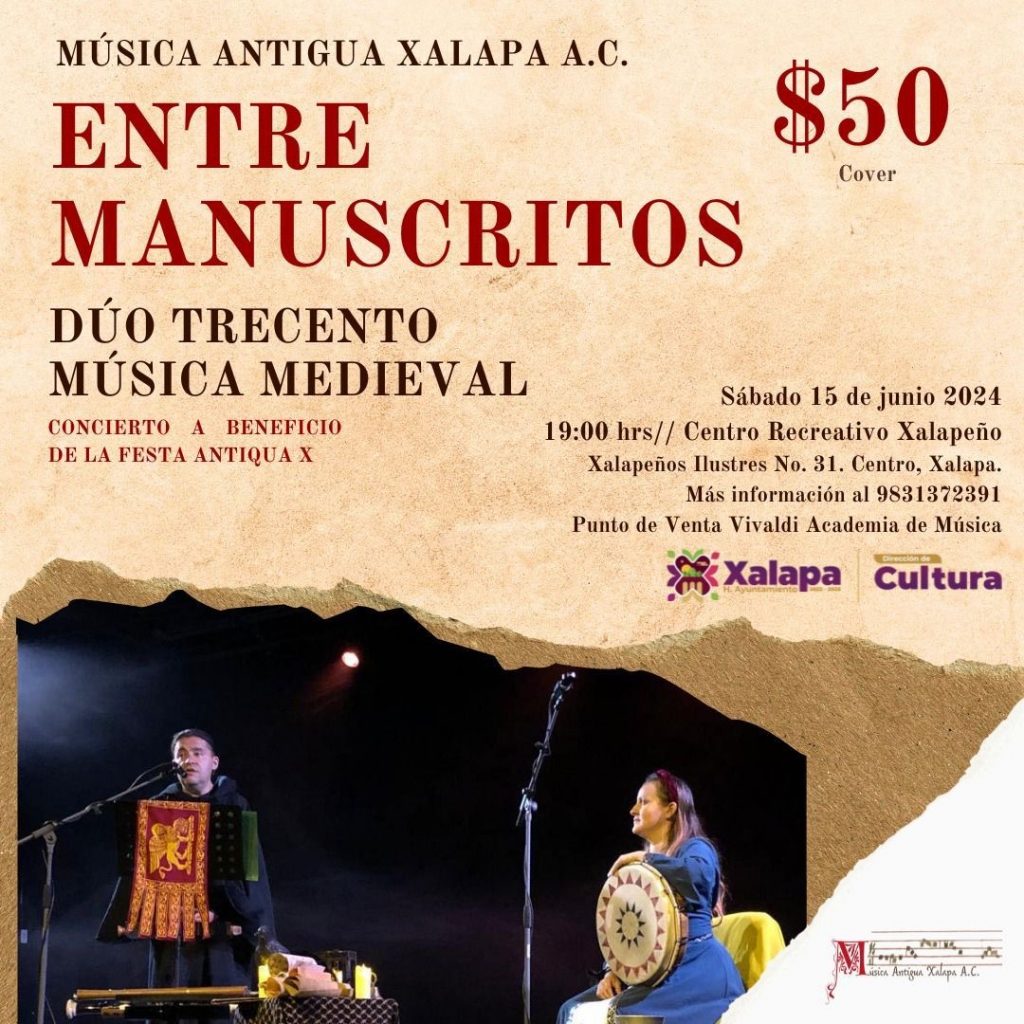 A las 19:00 horas en el CRX, el Dúo Trecento presentará el espectáculo musical “Entre manuscritos”, en beneficio de la Festa Antiqua X. El 16 de junio, a las 12:00 y 17:00 horas en el Teatro J.J. Herrera, el Ensamble Mexicano y la Rondalla “Voz Tempo” llevarán a cabo sus conciertos de aniversario.