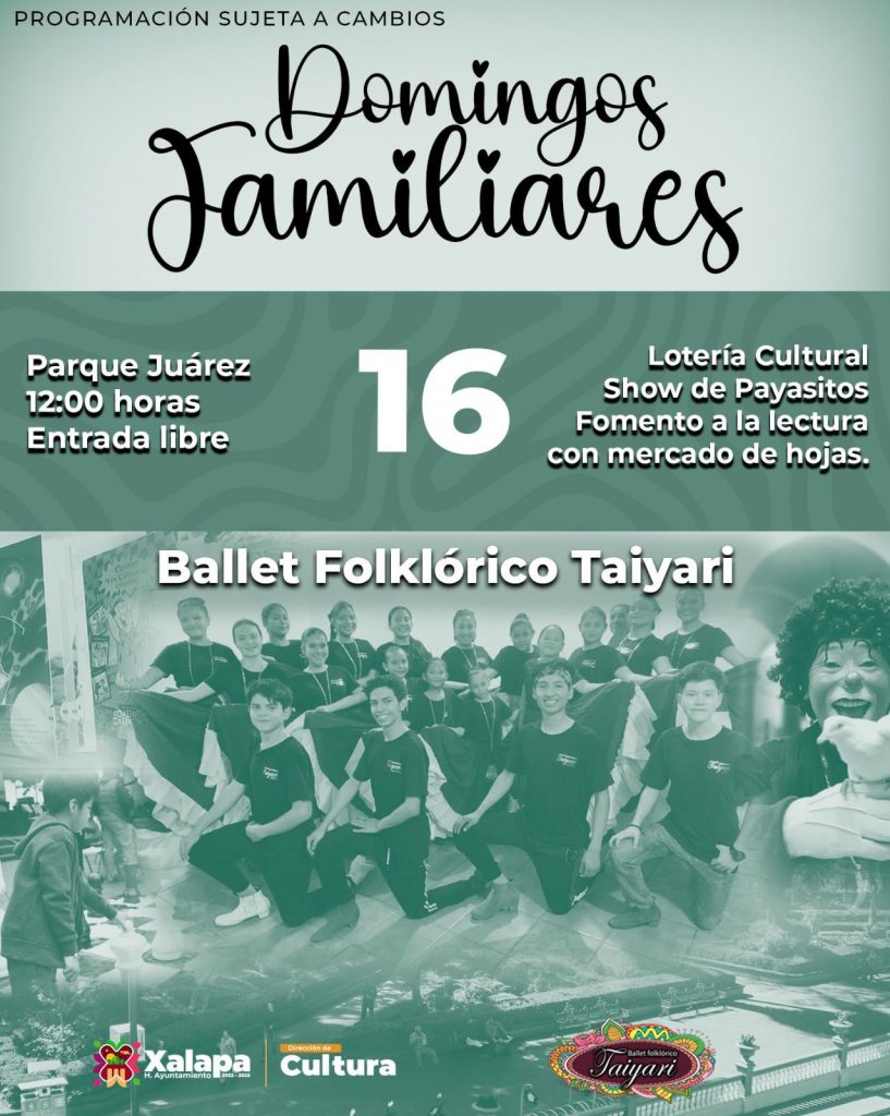 A la misma hora, en el parque Juárez, habrá música grabada de “Danzón pal’ Corazón”. A las 12:00 horas, el programa “Domingos Familiares” contará con la participación del Ballet Folklórico Taiyari, un show de payasitos, lotería cultural y actividades de fomento a la lectura con Mercado de Hojas.