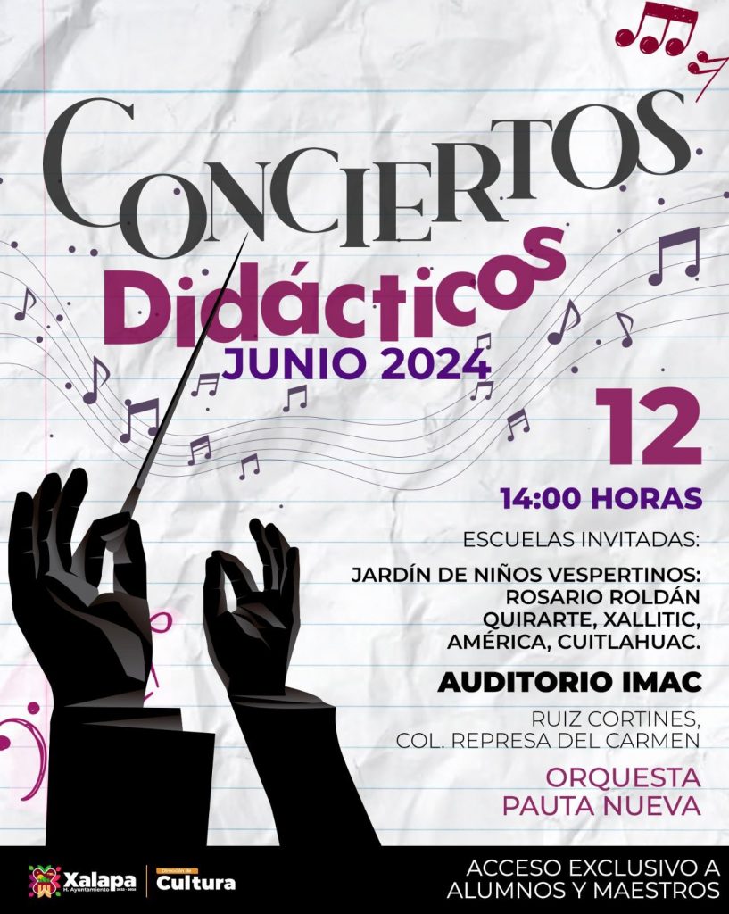 El 12 de junio a las 14:00 horas, en el auditorio de la IMAC, la Orquesta Pauta Nueva ofrecerá un concierto didáctico a los estudiantes de los jardines de niños vespertinos Rosario Roldán, Quirarte, Xallitic, América y Cuitláhuac.