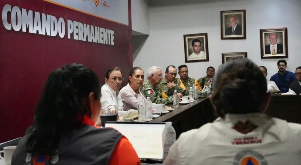 Poza Rica, ver., domingo 12 de octubre de 2025.– La presidenta de México, Claudia Sheinbaum Pardo, y la gobernadora, Rocío Nahle García, encabezaron la sesión del Comité de Emergencias en el Centro de Comando instalado en el Palacio Municipal de Poza Rica, donde evaluaron la situación provocada por la vaguada y la depresión tropical 90E, y definieron acciones inmediatas para atender a la población afectada.