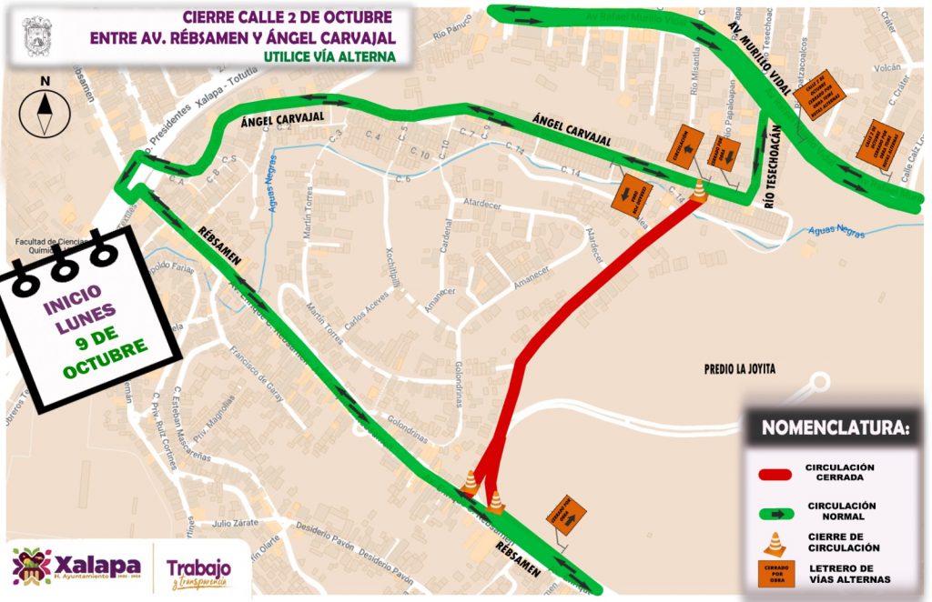 Xalapa, Ver.- Derivado de los procesos de introducción de infraestructura hidrosanitaria y la pavimentación con concreto hidráulico que se realiza en la avenida Enrique C. Rébsamen, a partir de este lunes se cerrará a la circulación vial la calle 2 de Octubre, entre Rébsamen y Ángel Carvajal.