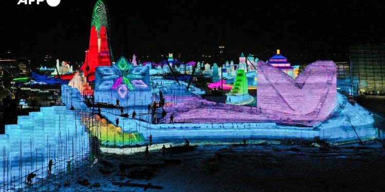 Para su construcción se utilizaron 300.000 metros cúbicos de hielo y nieve, incorporando elementos inspirados en los venideros Juegos Asiáticos de Invierno de Harbin 2025.