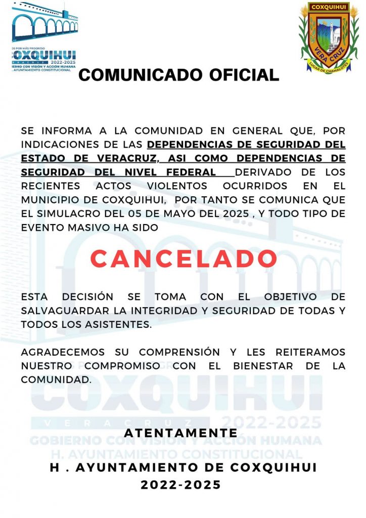 El Ayuntamiento de Coxquihui, indicó la suspensión total de eventos públicos y actividades masivas como respuesta a los hechos violentos registrados en las últimas semanas.