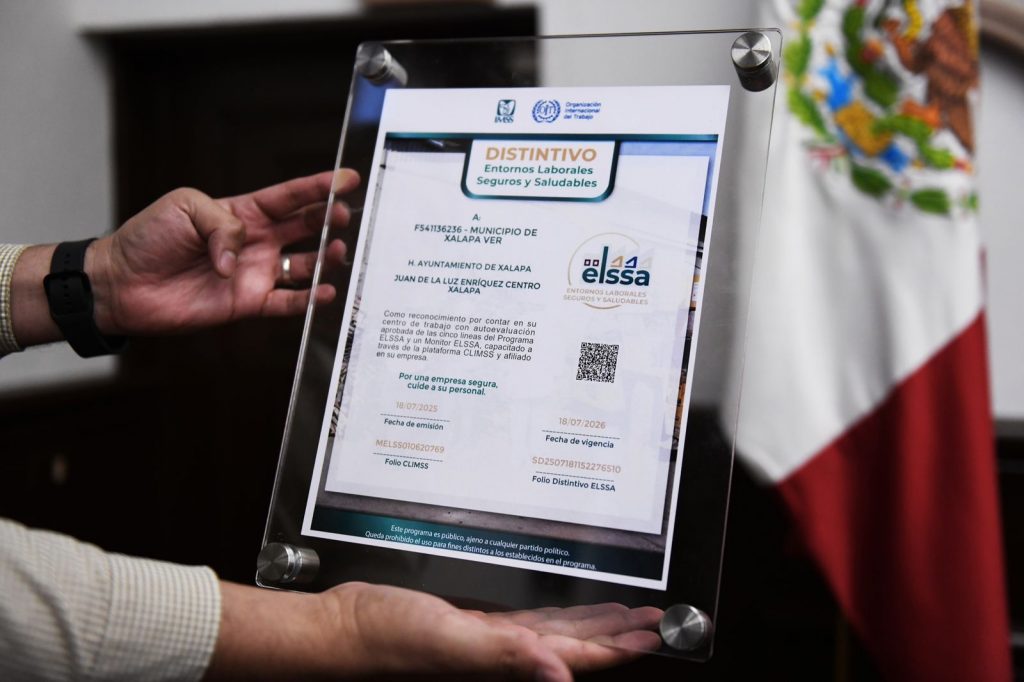 Xalapa, Ver.- Con el apoyo de la base trabajadora, esta Administración es un referente nacional en seguridad, paz y bienestar, aseguró el alcalde Alberto Islas Reyes, al recibir en nombre del Ayuntamiento el Distintivo ELSSA, en reconocimiento a las buenas prácticas realizadas en favor de los Entornos Laborales Seguros y Saludables.