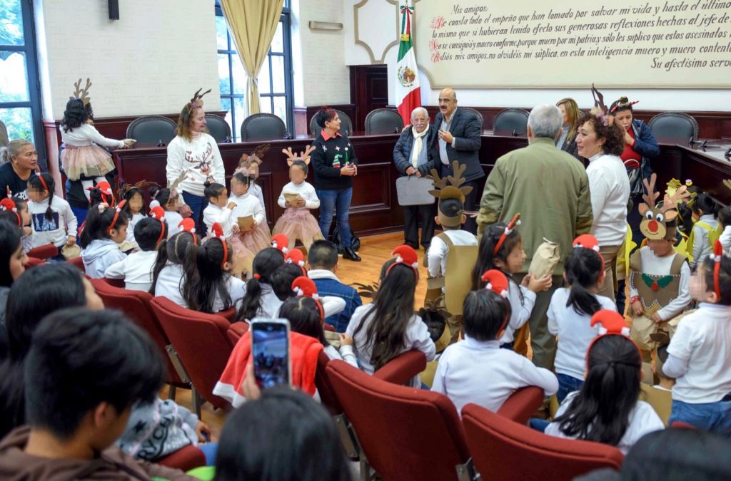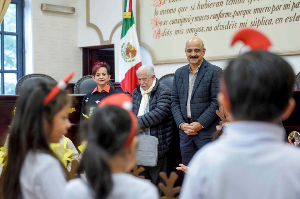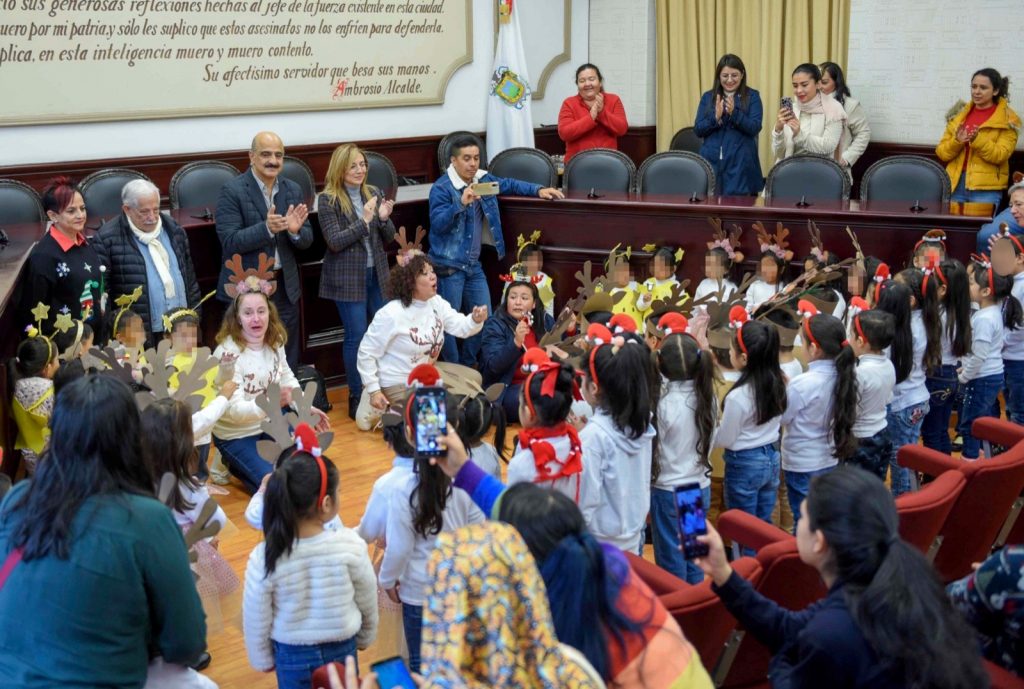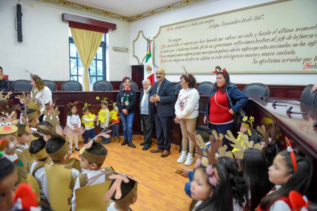 Xalapa, Ver.- El presidente municipal Ricardo Ahued Bardahuil recibió en la Sala de Cabildo a personal docente y alumnado del jardín de niños “Itzcalli”, quienes presentaron un Coro navideño e interpretaron melodías tradicionales de esta temporada.