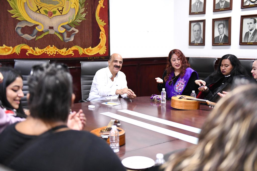 Xalapa, Ver.- Como parte de las actividades del XI Festival Internacional de Tunas Femeniles, que se desarrolla del 1 al 3 de agosto en esta capital, el alcalde Ricardo Ahued Bardahuil recibió en la Sala Ex Presidentes a integrantes de cuatro Tunas Femeniles originarias del estado de Coahuila, Ciudad de México, Michoacán y Chiapas.