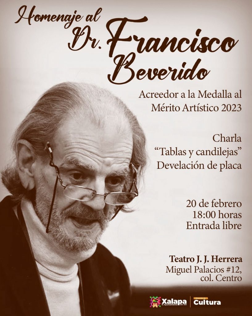 Xalapa, Ver.- El actor, dramaturgo, difusor cultural, académico de la Universidad Veracruzana (UV) y Doctor Honoris Causa por esta institución, Francisco Beverido Duhalt, será reconocido una vez más por el Ayuntamiento de Xalapa, cuando este martes 20 de febrero a las 18:00 horas en el Teatro J.J. Herrera se devele una placa en su honor.