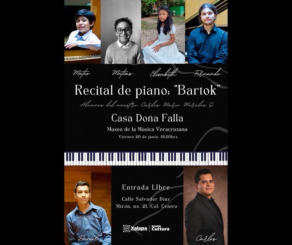 A las 18:00 horas en el Museo de la Música Veracruzana se tendrá el recital de piano “Bartok”, con invitados especiales, y a las 19:00 horas, como parte del Festival “Alberto de la Rosa”, se ofrecerá el concierto “La vieja guardia del son jarocho”.