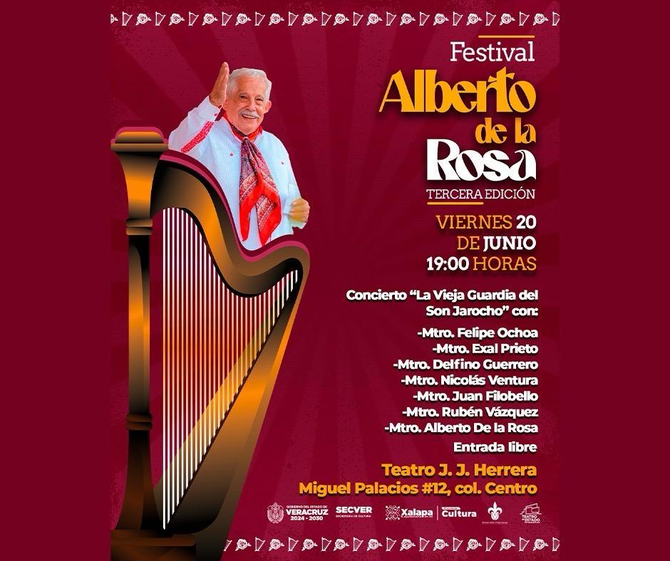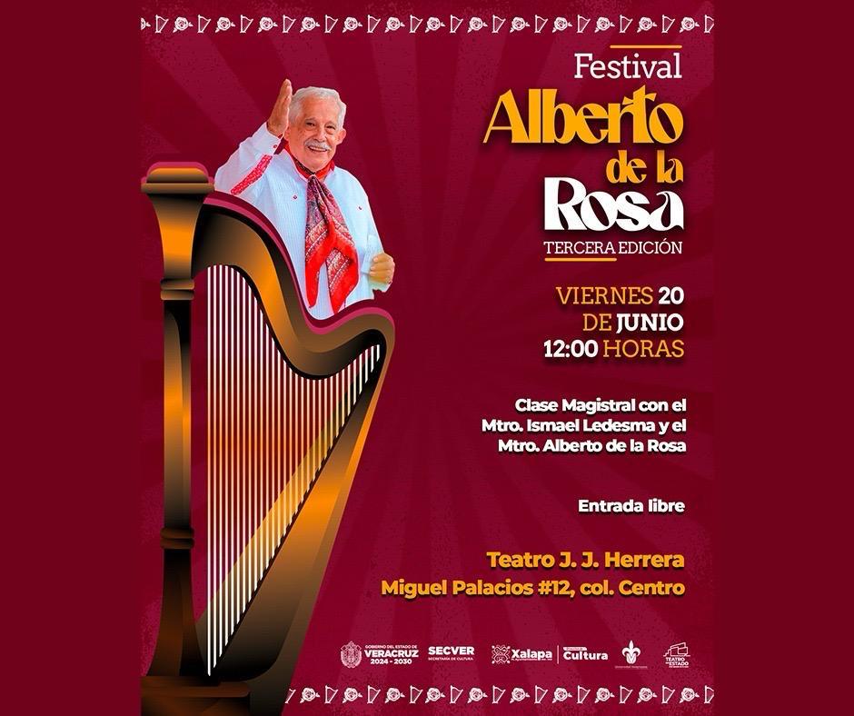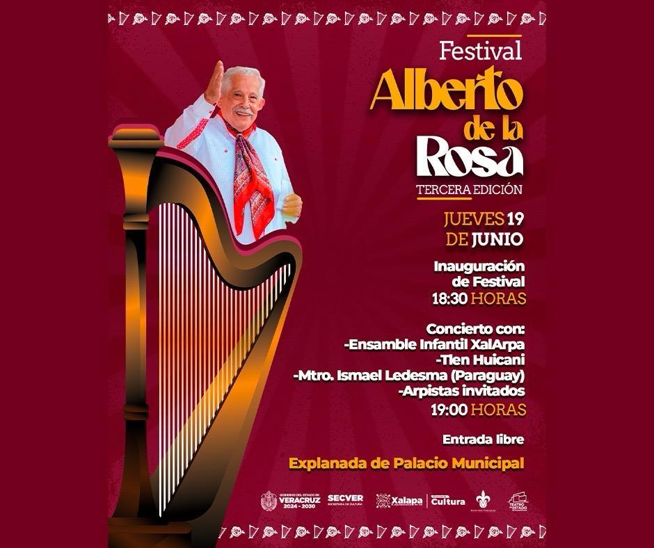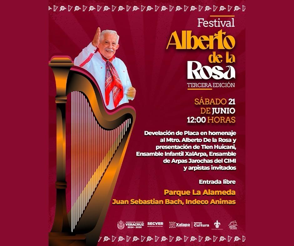 El sábado continuará el Festival “Alberto de la Rosa”. A las 12:00 horas, en el parque La Alameda, se develará una placa en homenaje al maestro Alberto de la Rosa. Además, se presentarán Tlen Huicani, el Ensamble Infantil XalArpa, el Ensamble de Arpas Jarochas del CIMI y artistas invitados.