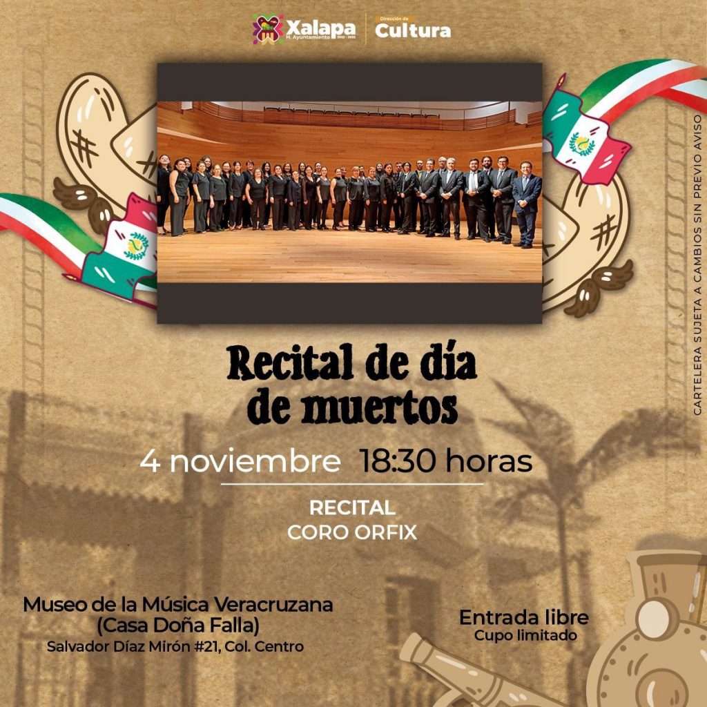 También, este 3 y 4 de noviembre a las 19:00 horas en el Teatro J.J. Herrera, Cuentos y Flores presentará su obra “El niño, la miseria y la muerte”; y el 4 a las 18:30 horas en el Museo de la Música Veracruzana, el coro de la Orquesta Filarmónica de Xalapa (ORFIX) llevará a cabo un programa especial.