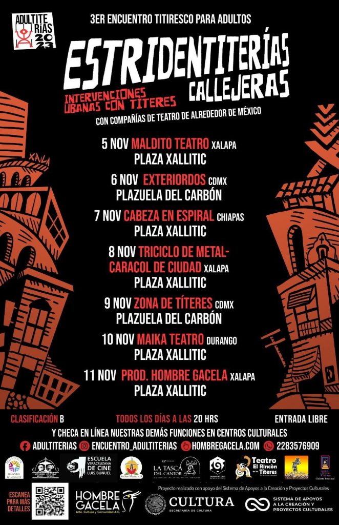 El 6 de noviembre a las 19:00 horas en este último recinto cultural, Astrid Valencia presentará “Para Lila, arquitectura de lo incontenible”, y a las 20:00 horas en la plazuela del Carbón, se realizará el Tercer Encuentro Titeresco para Adultos “Estridentiterías callejeras”, que también se repetirá el día 9.