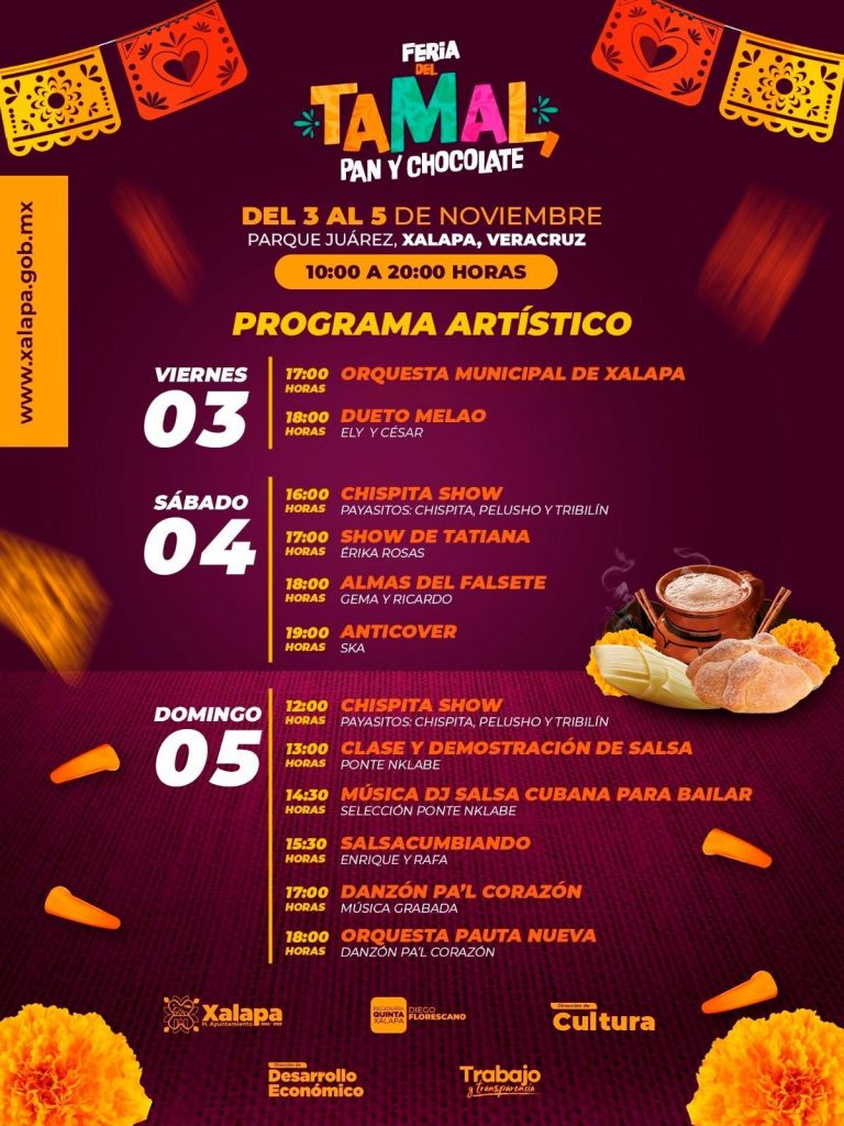 Xalapa, Ver.- La Feria del Tamal, Pan y Chocolate regresa al parque Benito Juárez del 3 al 5 de noviembre, y para amenizarla, se preparó un programa artístico y musical que contempla la participación de la Orquesta Municipal de Xalapa (OMX) y Pauta Nueva, artistas independientes, y agrupaciones de ska, salsa, cumbia y danzón.