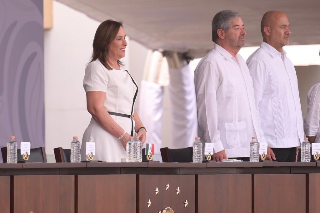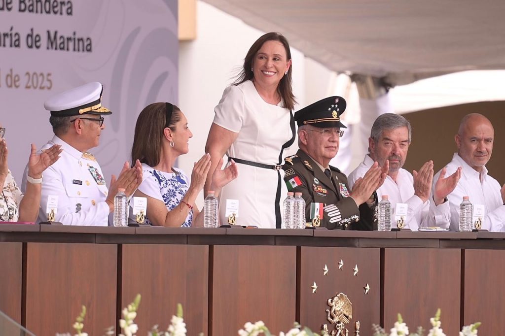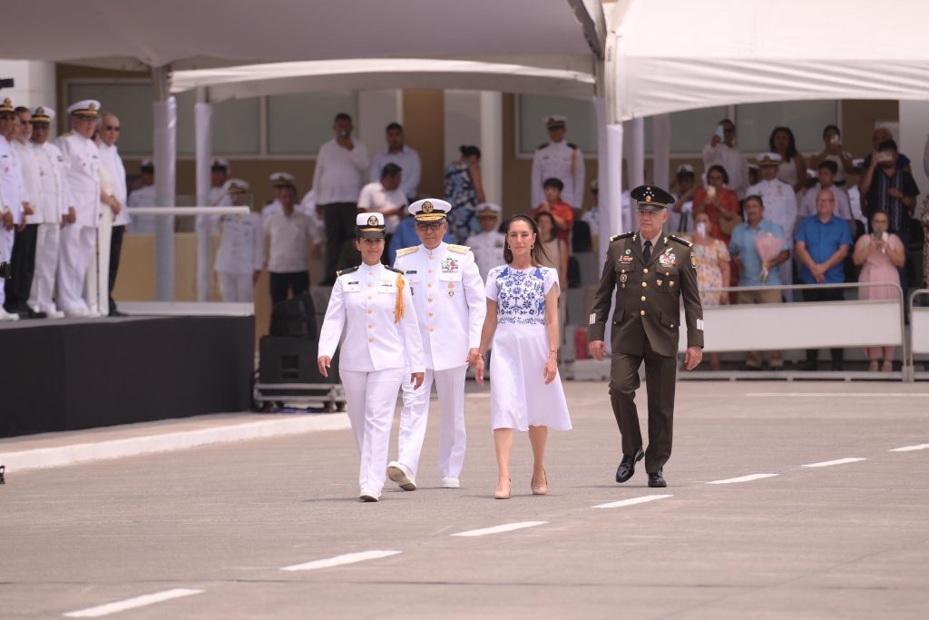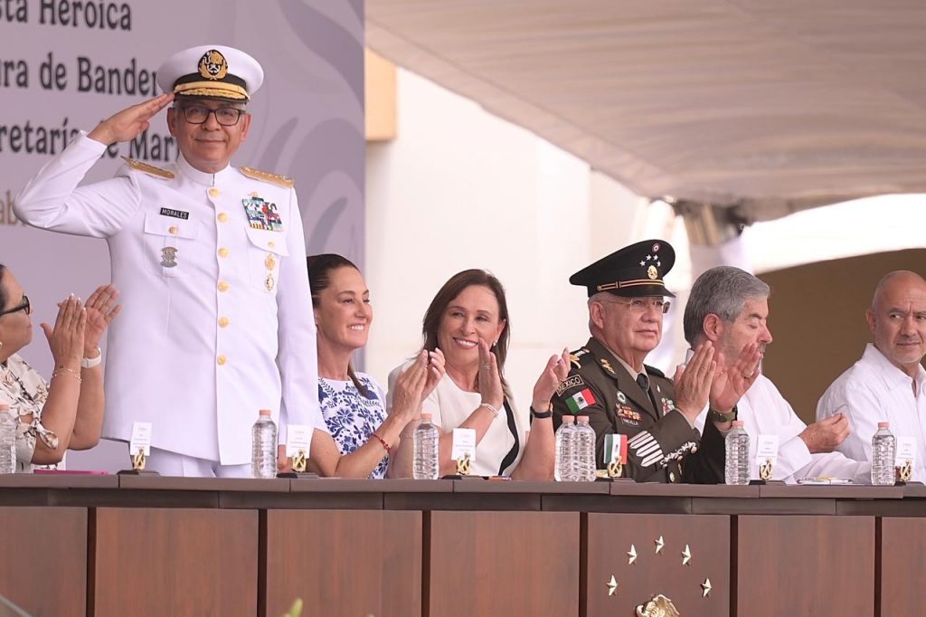 En su carácter de Comandanta Suprema de las Fuerzas Armadas, encabezó el acto solemne de Jura de Bandera, acompañada por los secretarios de Marina, Raymundo Pedro Morales Ángeles, y de la Defensa Nacional, Ricardo Trevilla Trejo.