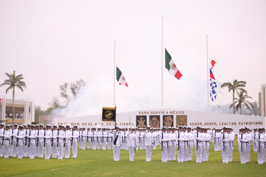 Con profundo respeto, la Jefa del Ejecutivo pasó lista de honor a los cadetes de la Heroica Escuela Naval Militar y del Heroico Colegio Militar, seguida del toque de Silencio interpretado por la banda de guerra y una salva de fusilería.