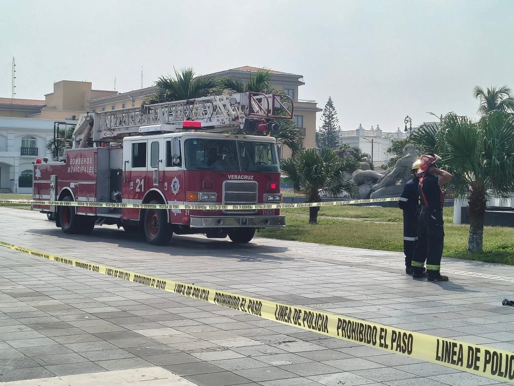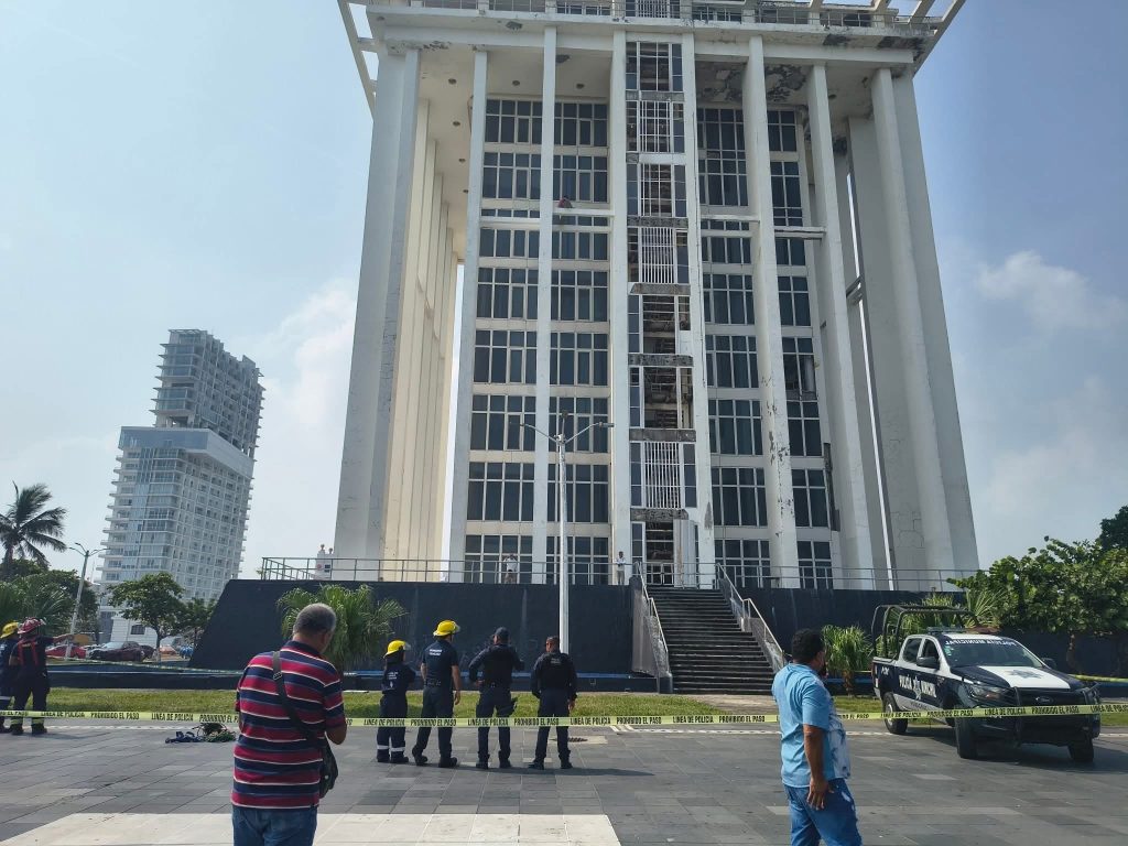 Elementos de Bomberos Municipales, Protección Civil, Policía Estatal y Policía Municipal de Veracruz llevan a cabo un operativo en la macroplaza del malecón de Veracruz debido a que un joven subió a lo alto de la Torre de PEMEX poniendo en riesgo su vida.