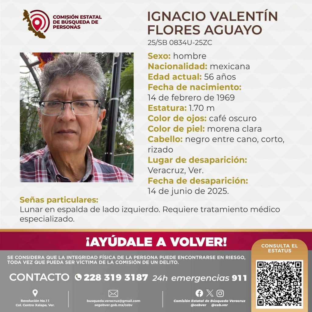 Familiares y allegados de Valentín Flores Aguayo reportaron su desaparición este sábado a las 11:00 de la mañana en el puerto de Veracruz, por lo que solicitan el apoyo de la ciudadanía para su pronta localización.