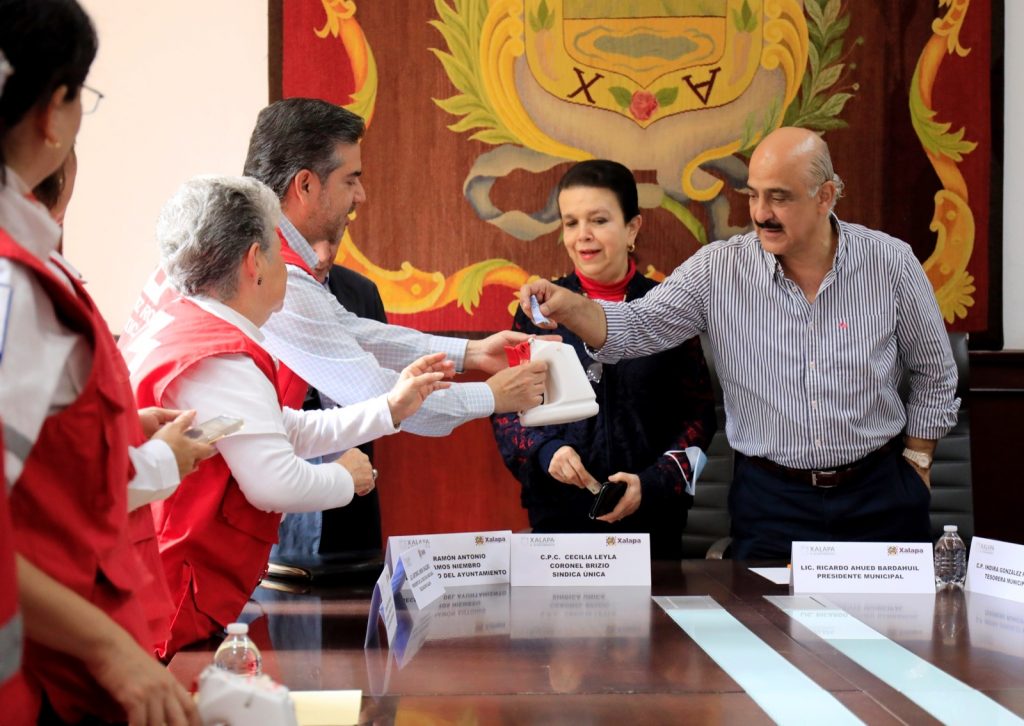 Xalapa, Ver.- El presidente municipal Ricardo Ahued Bardahuil realizó la entrega simbólica de un donativo a la Cruz Roja Mexicana Delegación Xalapa, con lo que el Ayuntamiento se suma a la Colecta 2023 que realiza esta corporación, con el fin de obtener los recursos necesarios para seguir apoyando a la población en caso de desastres, emergencias y atención de accidentes.