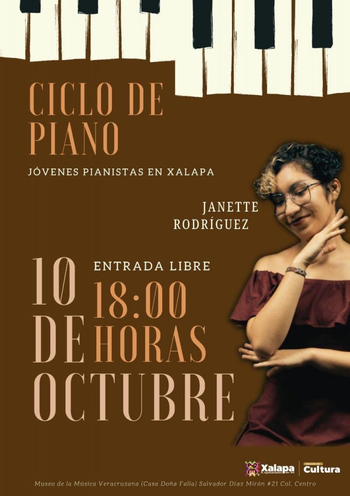 A las 18:00 horas en el Museo de la Música Veracruzana, Janette Fernández encabezará el Ciclo de Piano “Jóvenes Pianistas en Xalapa”; a las 19:00 horas en el CRX se proyectará la película “Frankenstein” (1931), de James Whale, como parte del Ciclo de Cine “El origen del horror”.