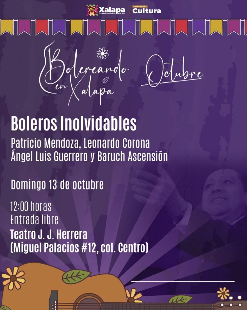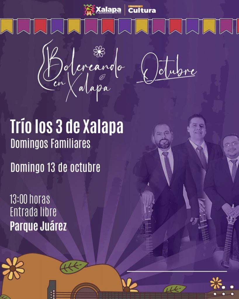 El domingo 13 de octubre a las 12:00 horas, en el Parque Juárez, se presentará el Trío “Los 3 de Xalapa”, además habrá un taller de Pint-arte, lotería cultural, show de payasitos y fomento a la lectura con Mercado de Hojas.
