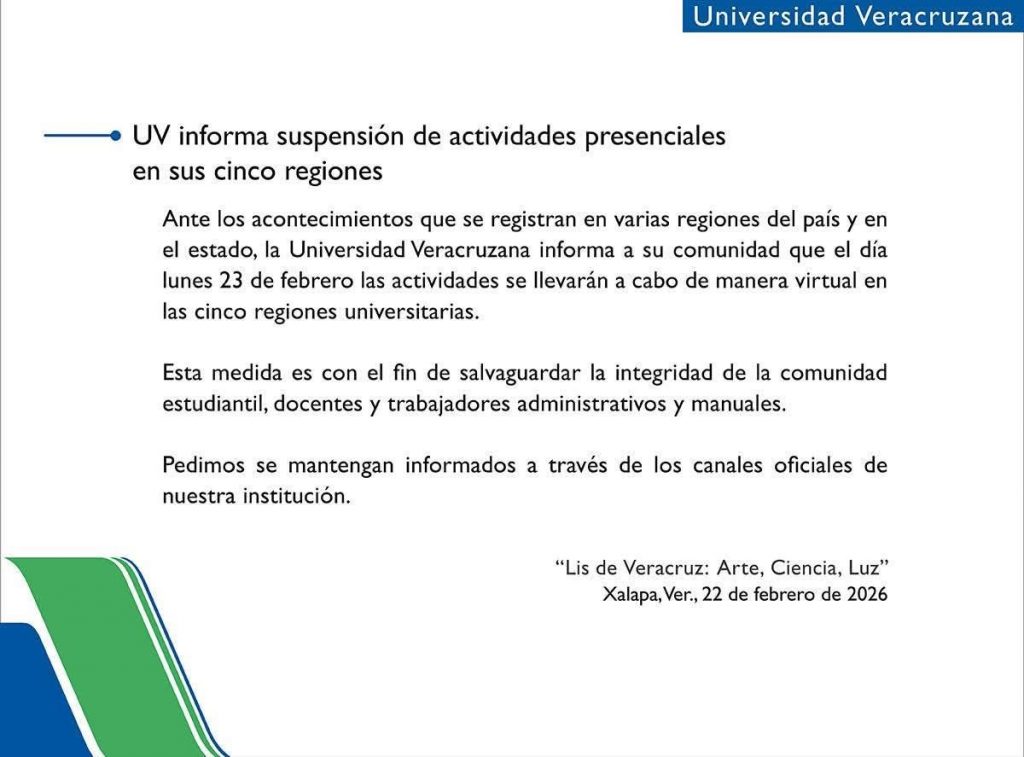 “Ante los acontecimientos que se registran en varias regiones del país y en el estado, la UV informa que el día lunes 23 de febrero las actividades se llevarán a cabo de manera virtual en las cinco regiones universitarias.” Posteó.