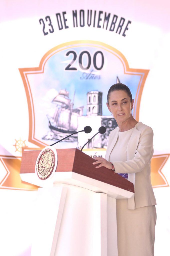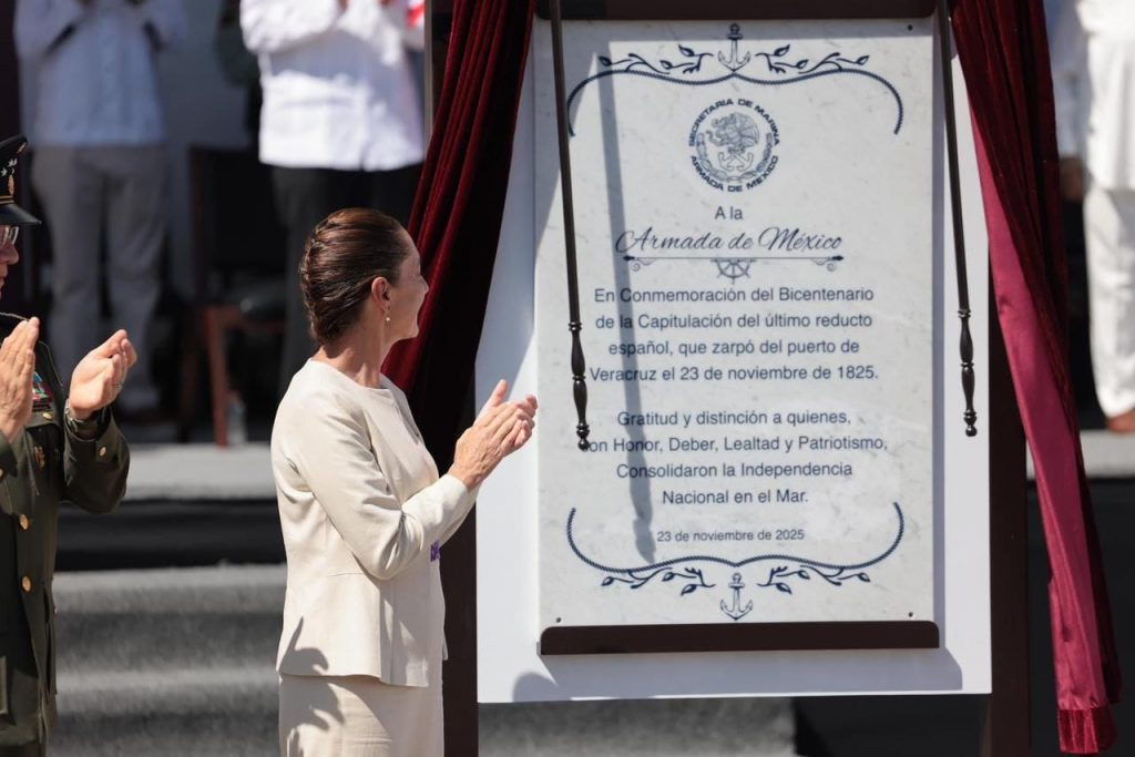 Veracruz, Ver., domingo 23 de noviembre de 2025.-Desde el Cuatro veces Heroico puerto de Veracruz y el Fuerte de San Juan de Ulúa, símbolos de la defensa nacional, la gobernadora Rocío Nahle García recibió a la presidenta Claudia Sheinbaum Pardo y al secretario de Marina, Raymundo Pedro Morales Ángeles, para conmemorar el Bicentenario de la Consolidación de la Independencia en la Mar y el Día de la Armada de México.
