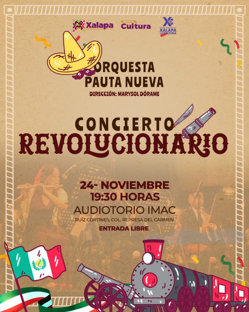 A las 15:00 y 22:00 horas, respectivamente, se presentarán en el parque Benito Juárez los Ballets Folklórico Itan de Hüi y de Danza Kids Cempoala, Pilcuicani Música Folklórica, Diego Roma, Xanáh, Avenida 10, Algoritmo Classic Techno Dark Disco Indie Dance y OGMA House-Dubstep Moombahton; y a las 19:30 horas en el auditorio de la IMAC, la Orquesta Pauta Nueva deleitará a los presentes con un “Concierto Revolucionario”.