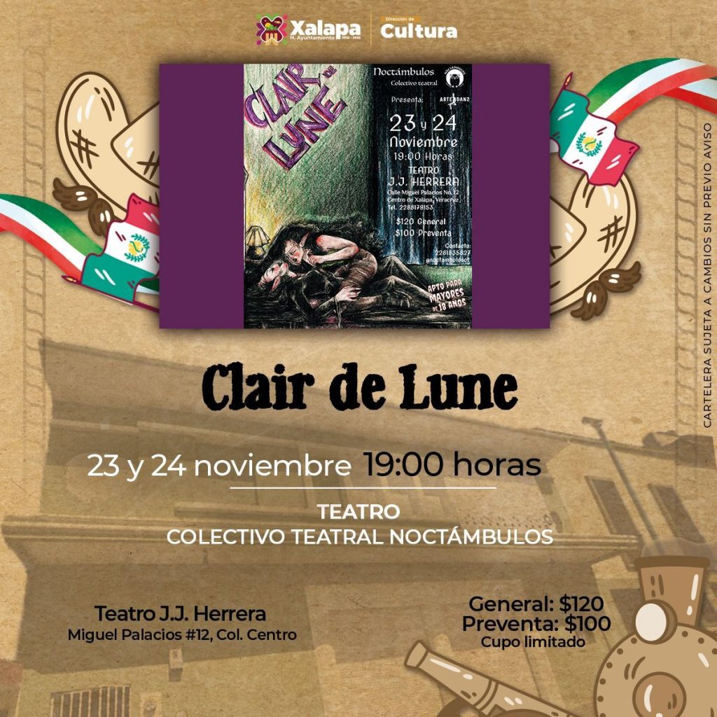 El 23 y 24 de noviembre a las 19:00 horas en el Teatro J.J. Herrera, el Colectivo Teatral Noctámbulos actuará su obra “Clair de Lune”, y los días 23 y 25 a las 17:00 horas y el 26 de noviembre a las 12:00 horas en el Museo de la Música Veracruzana se desarrollará la Master Class del Cuarteto de Bellas Artes para los beneficiados de Música de Cámara.
