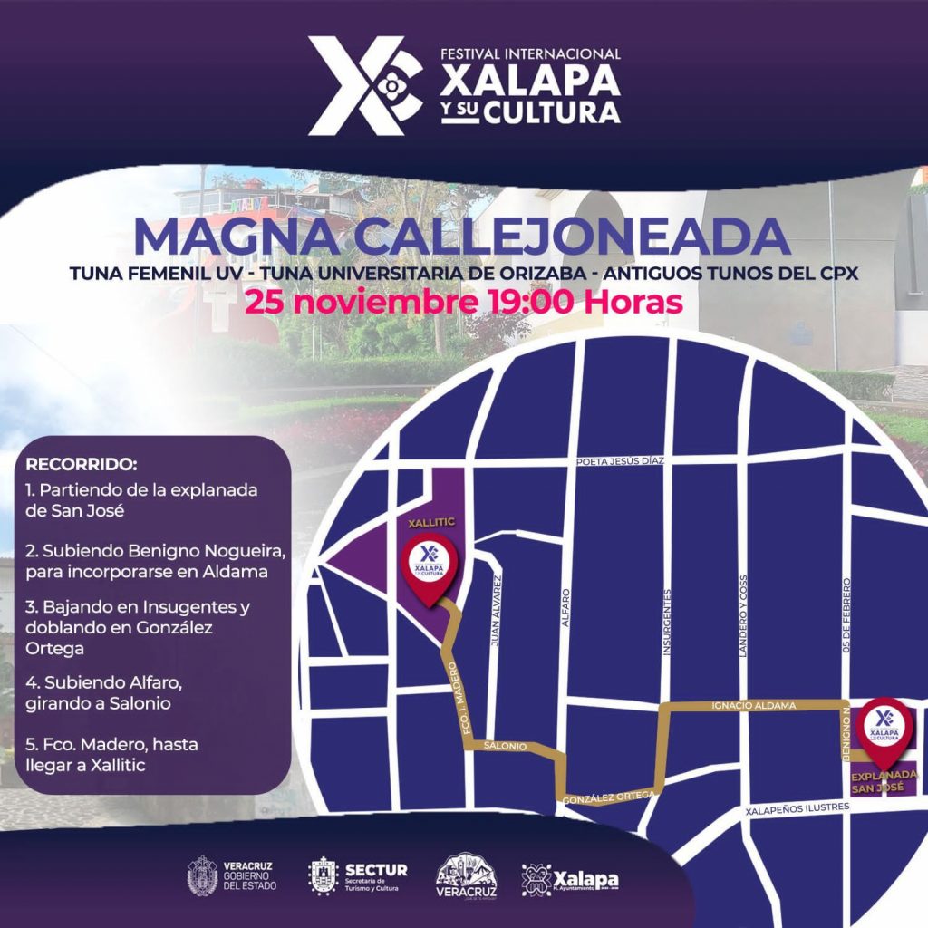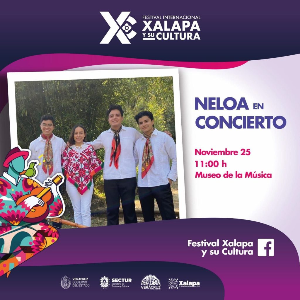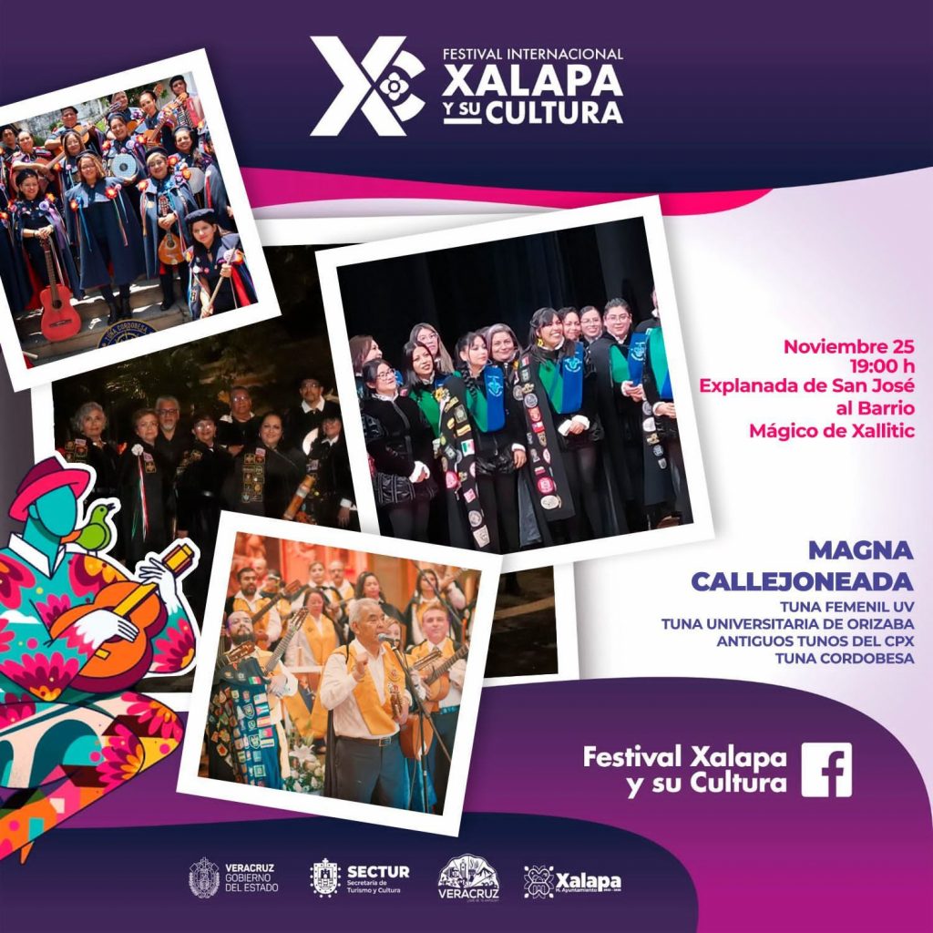 Como parte de las actividades del Festival Xalapa y su Cultura, a las 11:00, 12:00 y 13:00 horas en el Museo de la Música Veracruzana, se estarán presentando “Neloa”, “A piacere Ensamble” y un recital de viola y piano. Por su parte, entre las 14:00 y 20:00 horas, se darán cita en el Parque Juárez los Alegres Danzoneros del DIF Municipal, Orquesta Danzonera Cultura Danzón, Ballet Internacional de la SEV, Giova García, Kalany, Pierre Nicaisse y Los Foráneos. Y a las 19:00 horas desde la Explanada de San José hasta el Barrio Mágico de Xallitic será la Magna Callejoneada con la participación de las Tunas Femenil de la UV, Universitaria de Orizaba y Antiguos Tunos del CPX.