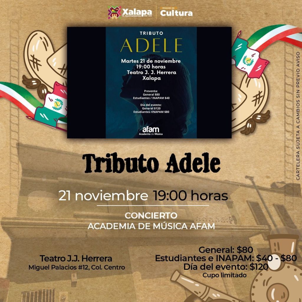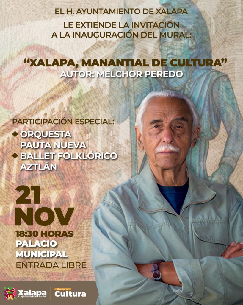 El martes 21 de noviembre a las 18:30 horas, Melchor Peredo inaugurará su mural “Xalapa, manantial de cultura”, en el Palacio Municipal, con la participación de la Orquesta Pauta Nueva y el Ballet Folklórico Aztlán; a las 19:00 horas en el Teatro J.J. Herrera, la Academia de Música AFAM rendirá un tributo a Adele.