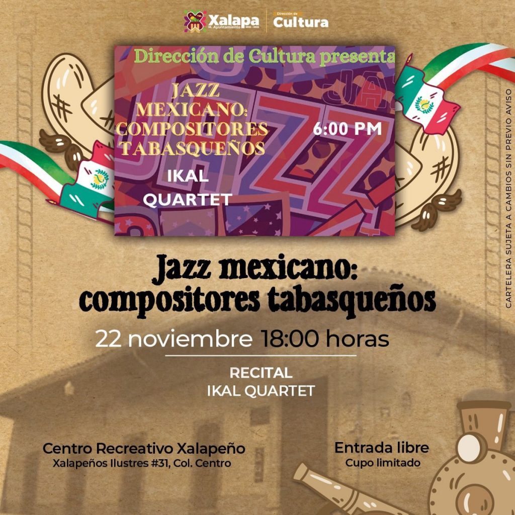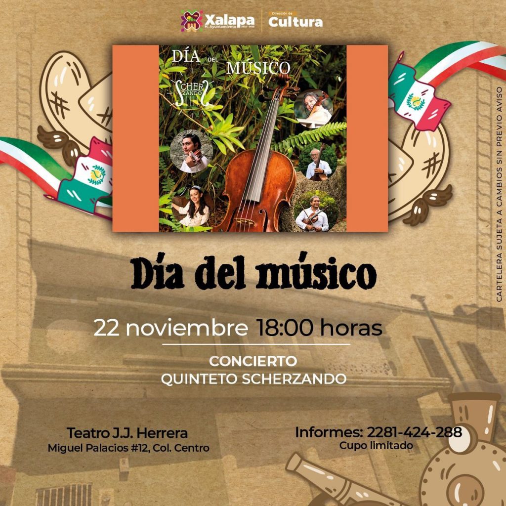 El miércoles 22 de noviembre a las 18:00 horas, en el Teatro J.J. Herrera, el Quinteto Scherzando festejará el Día del Músico, y a la misma hora y a las 19:00 horas, respectivamente, en el CRX, Ikal Quartet ofrecerá el recital de Jazz Mexicano: Compositores tabasqueños, y Carlos B. Barreto Cuarteto presentará “Latin Jazz”.