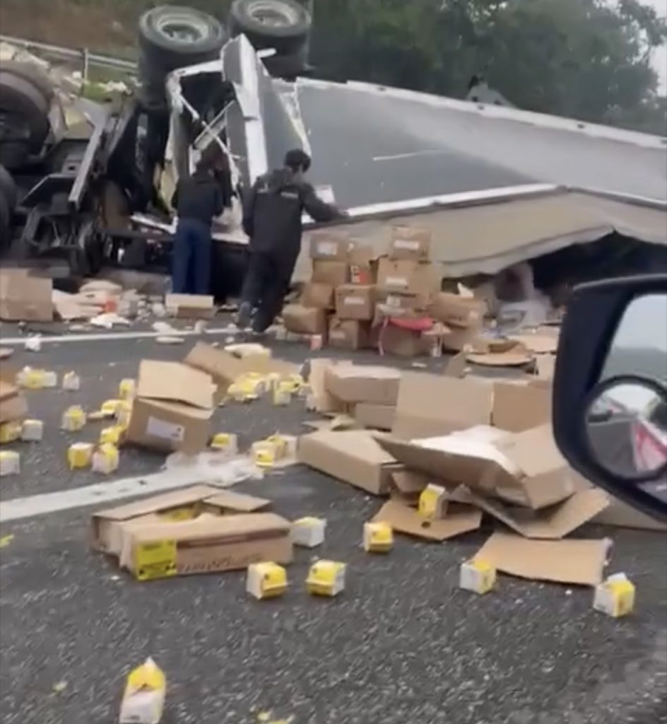 Tras el percance, cajas con carnes frías, nuggets, fresas y otros artículos quedaron dispersas sobre la carpeta asfáltica, situación que fue aprovechada por automovilistas y pobladores cercanos para llevarse los productos antes de que las autoridades lograran asegurar el área.