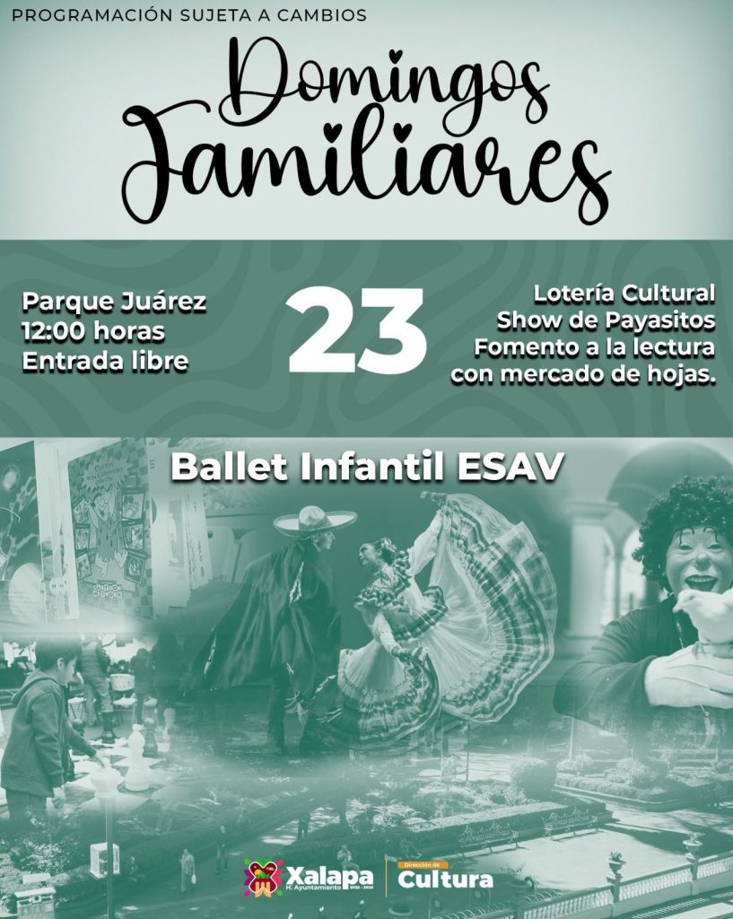 El domingo 23 de junio a las 12:00 horas, en el parque Juárez, estará el Ballet Infantil de la ESAV, junto con la Lotería cultural, un show de payasitos y actividades de fomento a la lectura con Mercado de Hojas; a las 17:00 horas habrá “Danzón pal’ Corazón”.