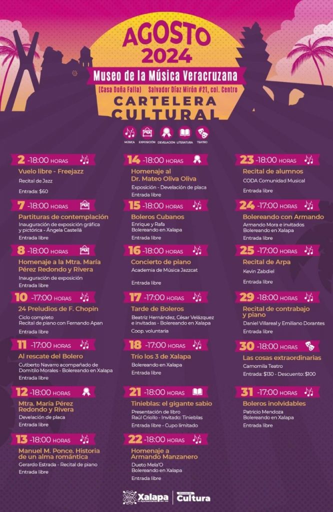El 12 de agosto a las 18:00 horas en el Museo de la Música Veracruzana se develará la placa de la maestra María Pérez Redondo y Rivera; y del 12 al 16 de agosto a las 17:00 horas en el CRX, René Ramírez impartirá el taller “La magia del papel picado”; el 14 de agosto a las 18:00 horas en el Museo de la Música Veracruzana, se inaugurará una exposición y se develará una placa en homenaje a Mateo Oliva Oliva, y a las 19:00 horas, se presentará “María en el país de las anomalías”, unipersonal de Daniela Luna.